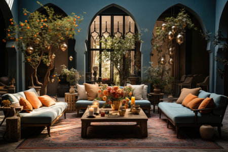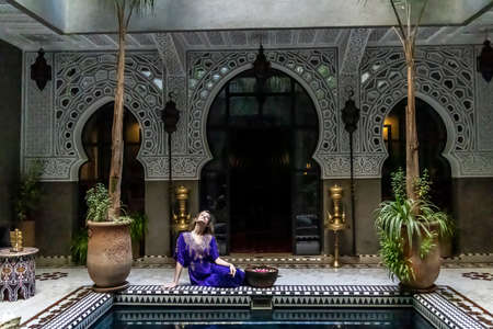 Oriental hospitality. Traveling by Morocco. Relaxing in festive moroccan traditional riad interior