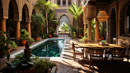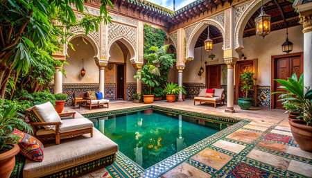 Moroccan courtyard with a pool, ornate arches, lush plants, and lounge seating. Clear details and vibrant col...