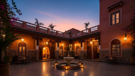 A bustling Moroccan riad with intricate tile patterns, a central fountain surrounded by lush greenery, and soft light filtering through carved wooden screens. The vibrant setting feels rich with history.