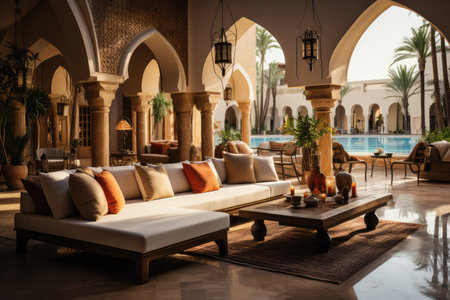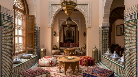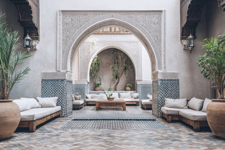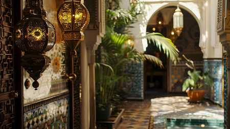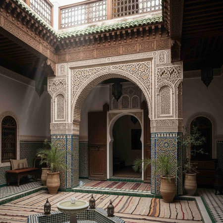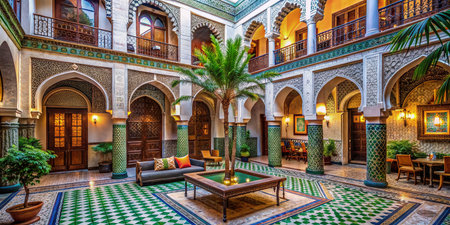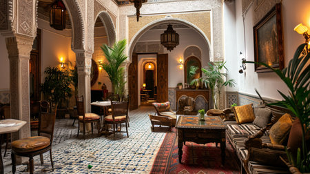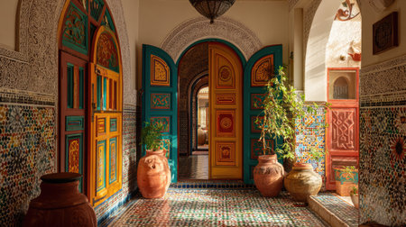 Vibrant tiles and intricate carvings adorn a serene Moroccan riad, exuding opulent Arabian elegance and warm hospitality, inviting visitors to immerse in traditional cultural splendor.