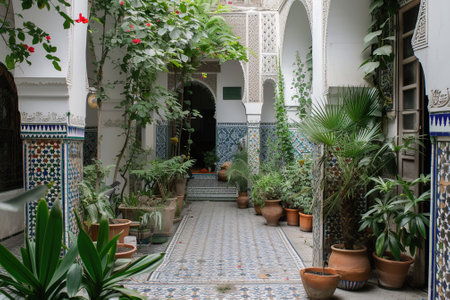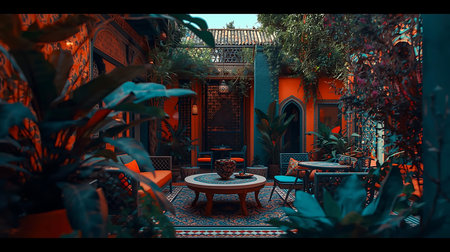 A vibrant Moroccan courtyard featuring lush plants, colorful tiles, and serene seating areas. The space blends traditional design with an inviting ambiance.