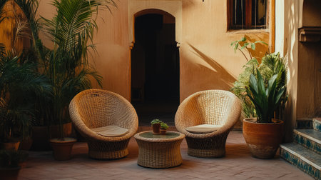 Relax in this cozy outdoor sitting area featuring woven chairs, a table, and lush greenery. Perfect for enjoying leisure moments in tranquil surroundings.