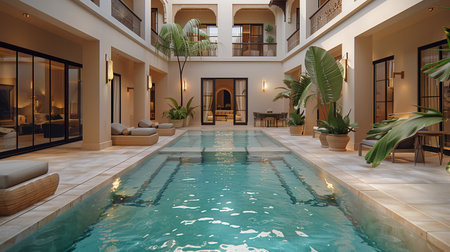 Elegant Indoor Pool Surrounded by Lush Greenery in a Modern Moroccan Courtyard Oasis