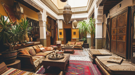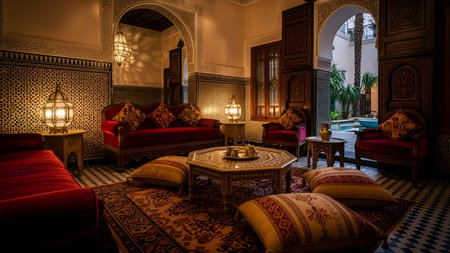 Luxurious Moroccan living room featuring intricate tile work, ornate lanterns, and plush seating, exuding warmth and cultural richness.