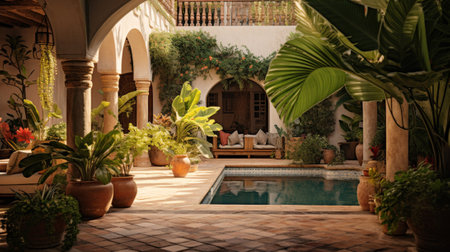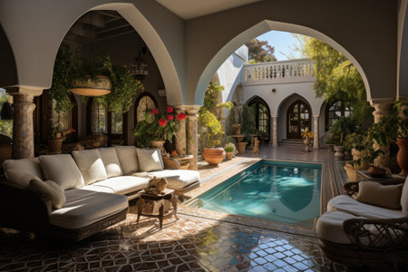 courtyard with pool, surrounded by arched openings, African architecture riad.Generative AI