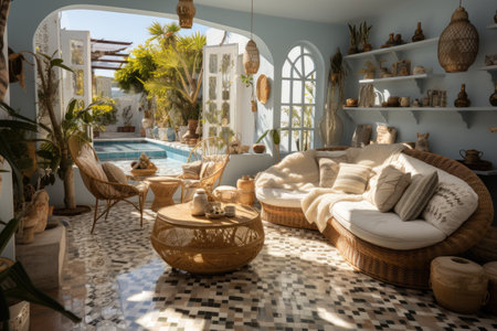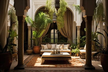 This image showcases a generously furnished living room adorned with numerous plants and greenery, A Moroccan riad with a tranquil courtyard, AI Generated
