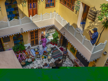 Jodhpur, India - Nov 6, 2017. Residential yard of an old two-story house in Jodhpur, India. Jodhpur is the second largest city in state of Rajasthan.