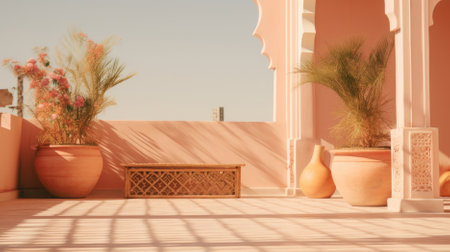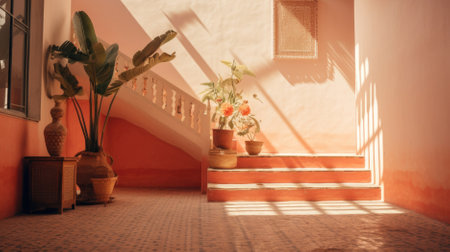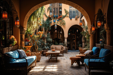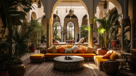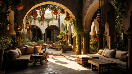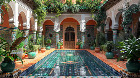 Decorated Moroccan Riad courtyard, featuring colorful tiles, lush plants, and a central fountain, conveying the tranquil and exotic atmosphere. Generative Ai