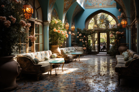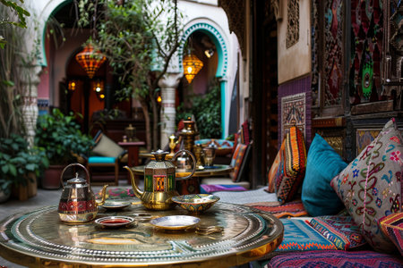 Eclectic Moroccan-style courtyard cafe. AI generative