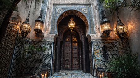 Explore the stunning beauty of a traditional Moroccan entrance with intricate tile work, hanging lanterns, and lush greenery, embodying rich cultural heritage.