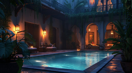 Courtyard pool at dusk, soft lighting, illuminated waters, cozy seating, peaceful atmosphere, detailed and scenic illustration --ar 16:9 --v 6 Job ID: eee7b07d-7c67-4be8-9710-1bd8aa229758 Generative AI