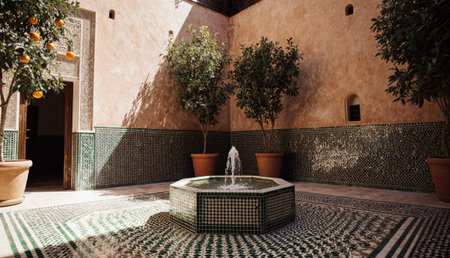 In a serene Moroccan riad, a stunning courtyard features a bubbling fountain surrounded by lush orange trees. Intricate tile work adds charm to this peaceful oasis bathed in warm sunlight.