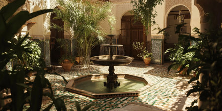 moroccan courtyard design, a beautiful moroccan courtyard featuring a traditional fountain surrounded by lush greenery and vibrant tiles, embodying the essence of moroccan design