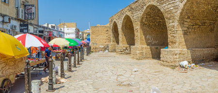 SOUSSE, TUNISIA - AUGUST 28, 2015: The inner side of citadel wall and the colorful sunshades of the merchants of spontaneous market, on August 28 in Sousse.