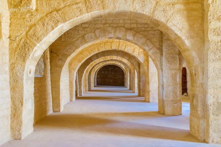 The chamber with the numerous stone arch in Ribat citadel, Sousse, Tunisia.