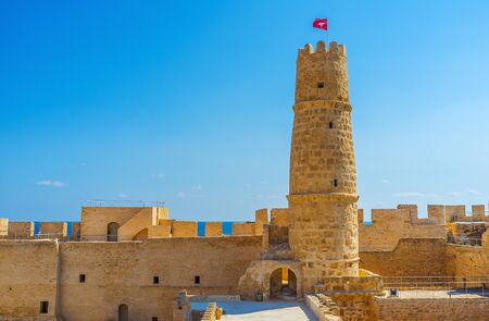 The tallest tower of Ribat with Tunisian flag on the top, the huge ramparts are seen on background, Monastir, Tunisia.