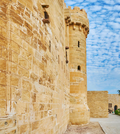 The huge defensive wall of Qaitbay citadel with a view on its tower , Alexandria, Egypt.