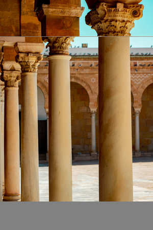 Long corridors under vaulted ceiling in ancient mosque of Kairouan in Tunisia.