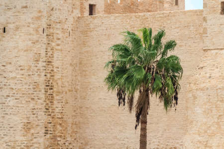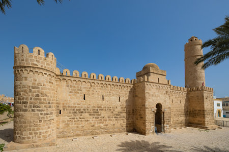 Historic fortified structure of Sousse Ribat framed by palm trees, Tunisia