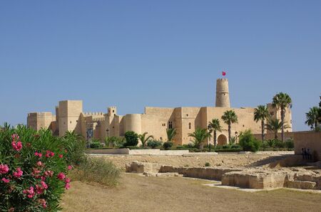 Ribat in Monastir in Tunisia, Africa in summer day. Stone fortress Ribat with a tower in the city of Monastir. Tunisia