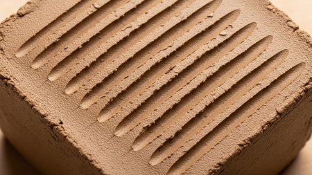 A close-up view of a textured brown brick with parallel grooves carved into its surface, highlighting its rough material.