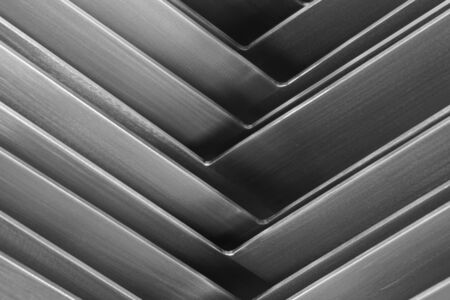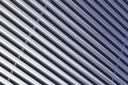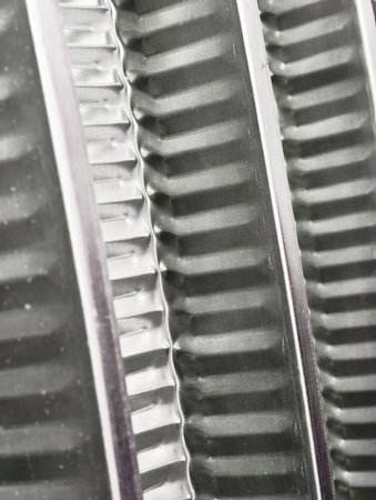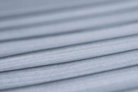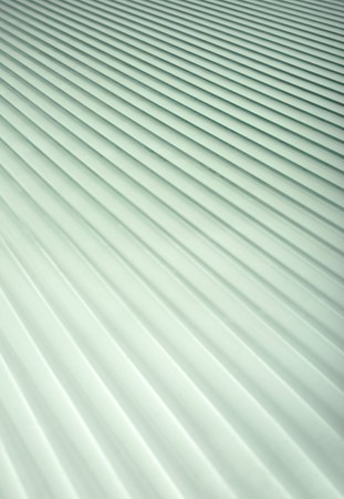 Macro view of a silver corrugated metal surface with distinct ridges and valleys. Blurred green and yellow background.