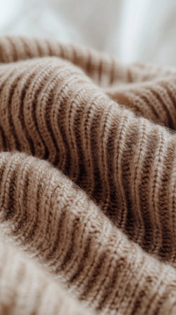 Close-up of beige knitted wool texture with wavy pattern, warm fabric concept