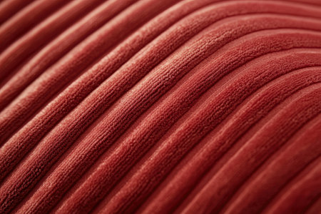 A close-up shot of red corduroy fabric with diagonal stripes, highlighting its textured surface and soft appearance.