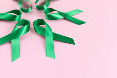 World mental health day concept. Green awareness ribbon with copy space for text on a green background.