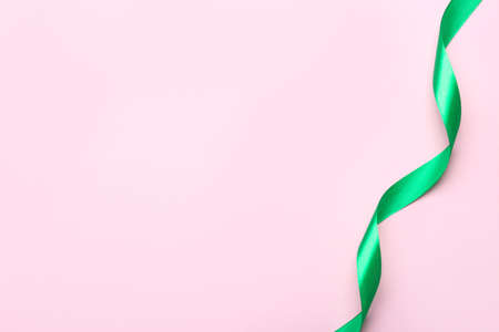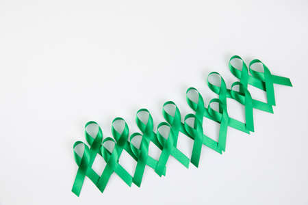 Green ribbon as symbol of disease control on white background top view copy space