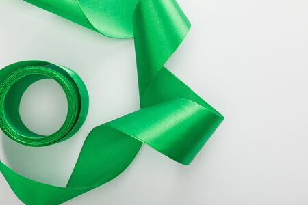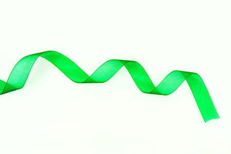 Green ribbon on white background, close-up. Shallow DOF
