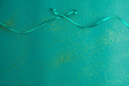 Emerald green satin ribbon bow on green with gold colored glitter. Christmas Holidays and presents concept flat lay with copy space