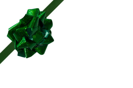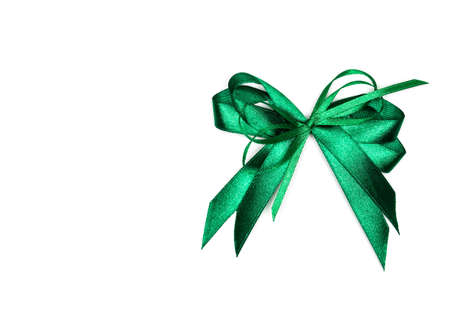 Single green ribbon plastic gift bow isolated on white background. Gift and holiday concept. Green ribbons isolated on white background. This is a decoration for a gift or a postcard.