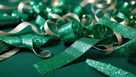 green ribbons on a green background, close-up, holiday background