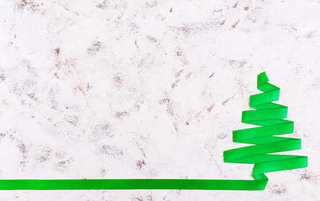 FlatLay with fir tree made of green ribbon, concept of Christmas time. Minimalist single line Christmas tree still life. Art idea. Selective focus.