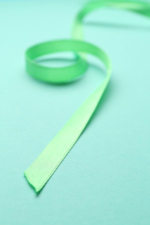 Beautiful light green ribbon on turquoise background, closeup