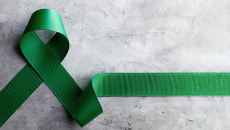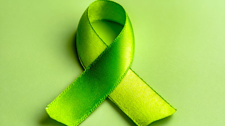 A vibrant green ribbon with a tiny red emblem rests gently on a textured background, illuminated by gentle, diffused light evoking compassion and hope.