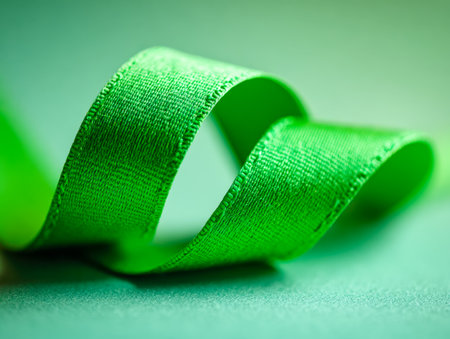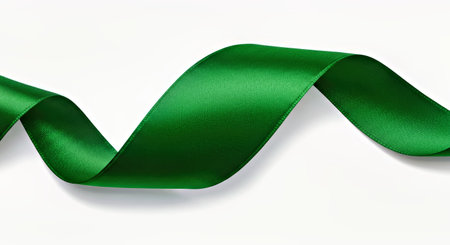 A sleek green silk ribbon gracefully twists on a lively green backdrop, symbolizing hope, health, and eco-awareness with vibrant visual appeal.