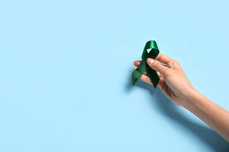 Hand with green ribbon on light blue background. Liver cancer concept