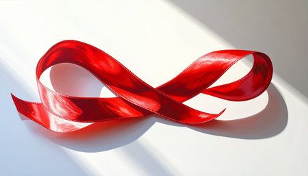 A bright red satin ribbon forms an infinity symbol on a white surface with strong light and shadow.