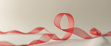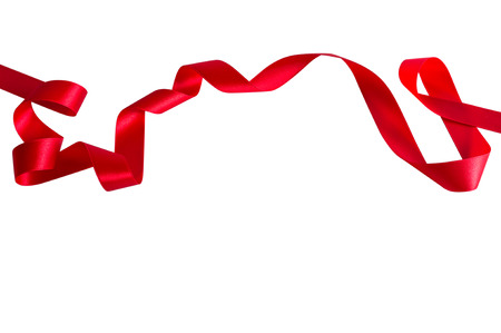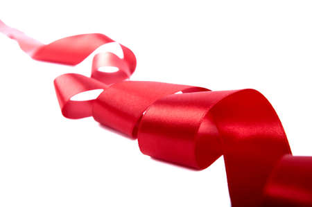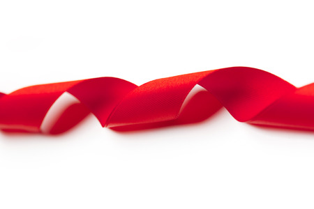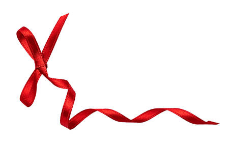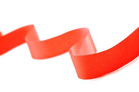A red ribbon is shown in the image. It is curled up and has a shiny appearance. The ribbon is placed on a white surface