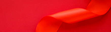 Red satin twisted ribbon on red background. Photo with copy blank space.