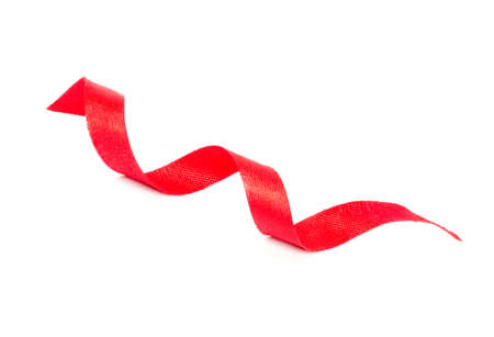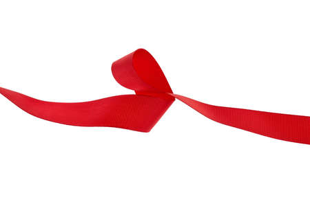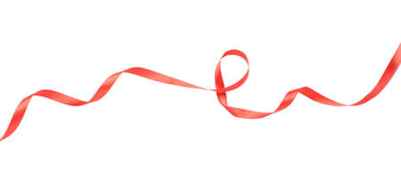 This image features a single, vibrant red ribbon elegantly curled and isolated against a clean, white background. The ribbon is the central focus, creating a striking contrast with the plain white backdrop. The image is ideal for various design and decorative purposes.
