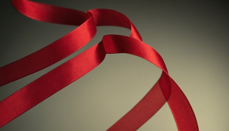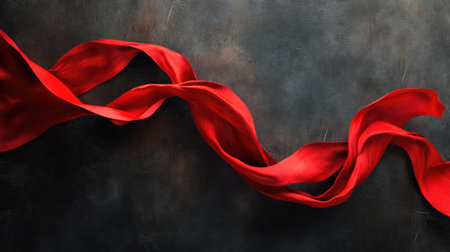 A striking red ribbon gracefully twists and curves against a soft dark background, showcasing elegance and beauty. Ideal for design projects or festive celebrations.