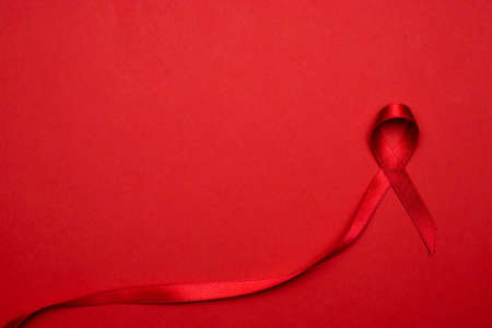 Hiv support. Red ribbon symbol in hiv world day on dark red background. Awareness aids and cancer. Aging health month concept