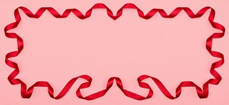 Red wavy ribbon on pink background. Holiday decoration. Valentine's Day decoration congratulation frame.