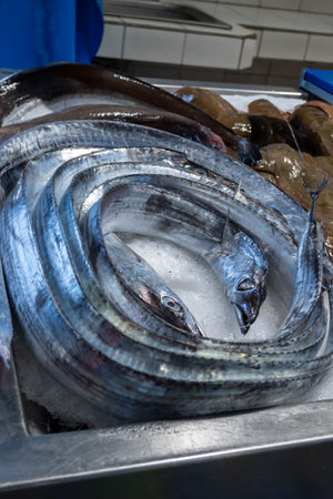 Atlantic largehead hairtails (also called espada in Portuguese) on traditional fish market Mercado dos Lavradores in Funchal, Madeira island, Portugal