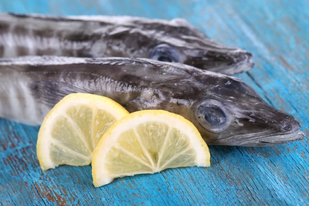 Fish with lemon on blue wooden table