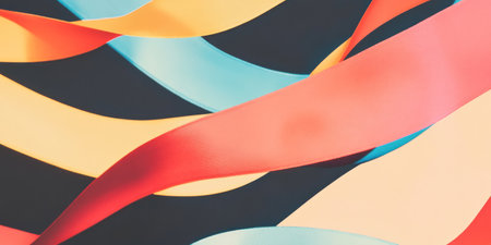 Vibrant ribbons dance against a dark backdrop creating a striking visual contrast with clean shadows