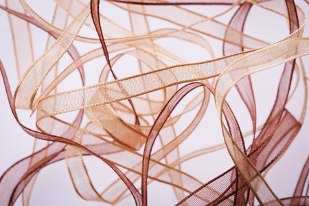 Satin narrow ribbons of pink, white, gray, brown, blue and yellow colors are randomly scattered on a white background. Wallpaper.Abstract background.